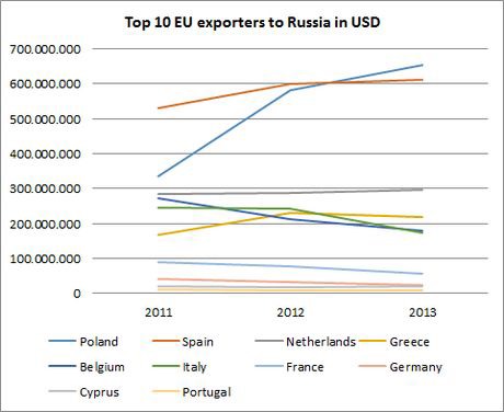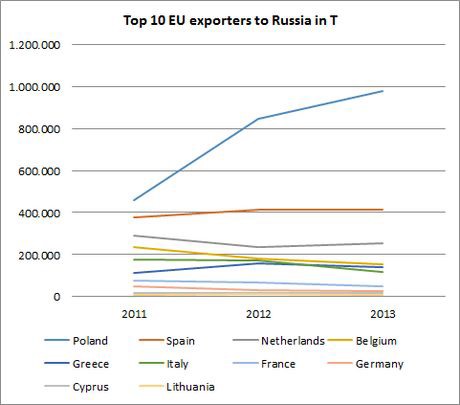 De Big Five van grootste exporteurs in volume naar Rusland zijn Polen, Spanje, Nederland, België en Griekenland. De Poolse export is sinds 2011 bijna verdubbeld: van 460.566 ton naar 976.595 ton in 2013. Ook de Spaanse export is gegroeid ten opzichte van 2011 naar 412.071 ton. Dat is overigens wel een daling ten opzichte van het volume in 2012. Datzelfde geldt voor de Griekse export. Na een piek in 2012 van 157.996 ton daalde het volume vorig jaar naar 139.904 ton. Ten opzichte van 2011 is dat wel een stijging. De export uit Nederland en België is sinds 2011 gedaald, naar respectievelijk 254.991 ton en 154.560 ton. Overigens is de export vanuit Nederland wel gestegen ten opzichte van 2012.