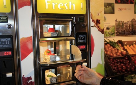 Groenten en fruit uit een vendingmachine in het Holland-Paviljoen. Bezoekers konden gezond snacken, maar natuurlijk wel tegen betaling.