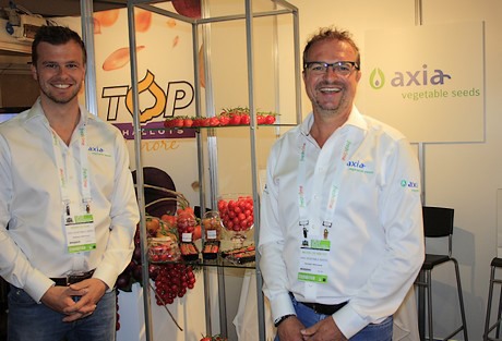 Lachende gezichten bij Axia. Edwin de Kok en Michel de Winter promoten verschillende tomatenrassen.