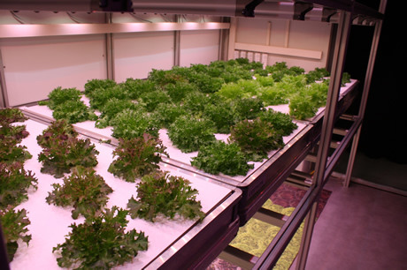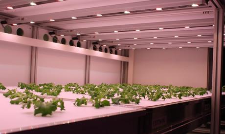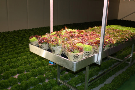 In de stellages wordt hoofdzakelijk sla in kokospluggen met water en onder ledverlichting geteeld. "Momenteel halen we onze sla nog een deel van het jaar uit Zuid-Europa. Nadelen hiervan zijn dat het klimaat grillig is en de transportafstanden lang. Als de sla hier straks uit de vertical farm komt, is die verser, komt er geen bestrijdingsmiddel bij kijken en is de kwaliteit stabiel", somde de directeur op. "Daarbij is de teelt duurzaam, zo weten we het waterverbruik maal tien te reduceren. En we kunnen veel beter plannen. Als we op dag 1 planten, kunnen we op dag 30 oogsten. De eerste kroppen lollo bionda, lollo rosso, rucola en frisee uit deze klimaatkamers komen dus dit jaar al op de markt."