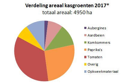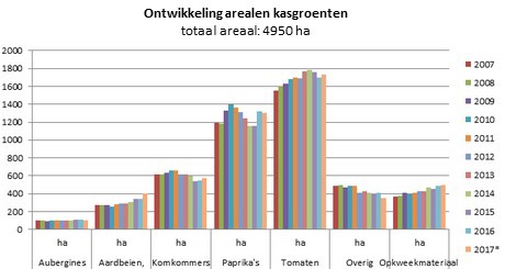 De cijfers zijn afkomstig van het CBS. Het statistiekbureau heeft de eerste ramingen over 2017 bekend gemaakt. De meeste vruchtgroenten zijn redelijk stabiel: er staat 10 hectare minder aubergines, 20 hectare meer komkommers, 20 hectare minder paprika en 30 hectare meer tomaat.