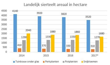 Uit de cijfers blijkt dat het totale areaal onder glas (bloemen, planten, groenten) dit jaar harder zal dalen dan de afgelopen drie jaren en wel met 300 ha. Het areaal glas komt daarmee uit op 3520 hectare landelijk t.o.v. 3820 vorig jaar.