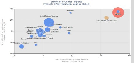 De groei van de import van tomaten in diverse landen. Zowel tussen 2012-2016 (horizontale als) als tussen 2015-2016 (verticale as) staat de Wit-Russische importstijging op unieke hoogte. Klik hier voor vergroting.