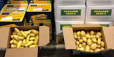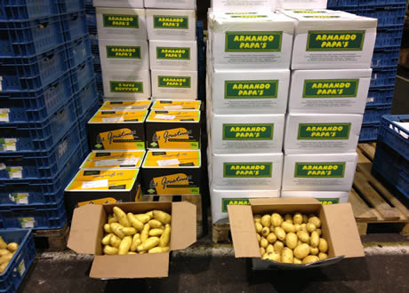 "Momenteel hebben we weer nieuwe oogst Annabelle en Agata", vertelt Bart. "De Agata komt nu uit Frankrijk en is zachtkokend. De Annabelle is vastkokend en momenteel afkomstig uit Duitsland. De schil van beide aardappelen is geel van kleur. Ook zijn ze allebei geelvlezig. We werken al zo'n tien jaar met deze rassen en leveren deze in mooie dozen. Hier zijn de klanten zeer over te spreken. De nieuwe aardappelen worden speciaal in gesloten dozen verpakt, zodat ze niet groen worden. Ook zijn de dozen makkelijk stapelbaar." Naast deze twee rassen komt er bij Armando Papa's wekelijks nieuwe leveringen binnen uit verschillende landen. "Met name het zuiden van Europa zoals bepaalde delen van Frankrijk, Italiƫ en Spanje leveren nu nieuwe vroege oogst. Ook Duitsland levert al. We zijn ook al een tijdje bezig met primeurs uit eigen land (vanaf juli). Niet grootschalig, omdat de aardappelen in het begin niet velvast zijn en dus moeilijker te bewaren."