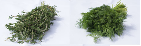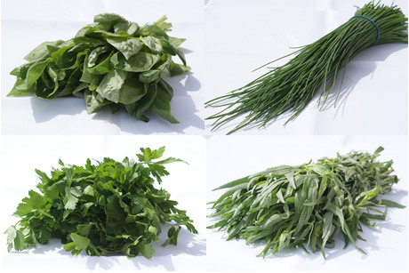 Vanaf linksboven met de klok mee: basilicum, bieslook, dragon en bladpeterselie