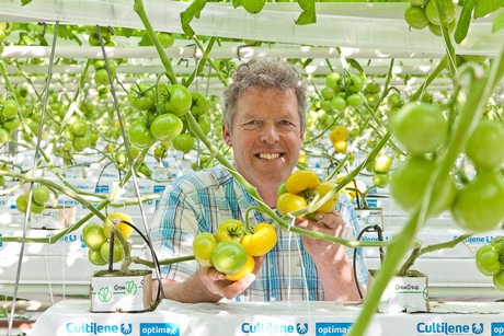 Gisteren is Kees Stijger uit Honselersdijk begonnen met de nieuwe oogst van 2014. Op 2,5 hectare teelt hij gele, oranje en rode trostomaten. "Er komt een goede productie aan", verwacht Stijger. "De kas is lekker groen en het gewas hangt er mooi bij." Stijger is iets later op de markt dan vorig jaar. Na de eerste twee weken van januari werd het weer langzaam iets donkerder. "Daar hebben we wat last van."
