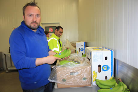 EuroFruitPorts heeft een koelhuis van 13.600 m2 en deze is volledig operationeel op een totale site van 38.700 m2. "We vinden het belangrijk dat alles veilig is en netjes blijft, dus daar wordt streng op gecontroleerd", benadrukt Peter. "Per jaar lossen we zo'n 200.000 ton fruit uit het schip en 50.000 ton uit containers. Dat is gemiddeld 3500 pallets bananen en 1000 pallets ander fruit per week. Het meeste fruit staat is hier binnen enkele dagen weer weg. Op vrijdag blijven er nog enkele honderden pallets staan en maken we de opslagruimte weer gereed voor de nieuwe aankomsten van maandag."