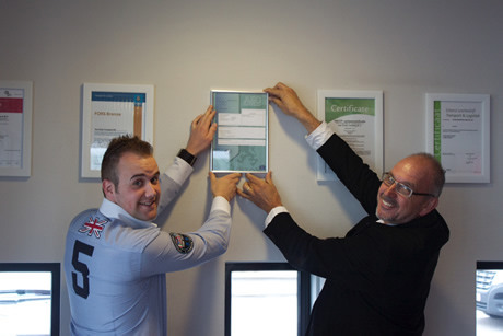 Coldstore-manager Dannie en schade- en kwaliteitsmanager Johan hangen het AEO-certificaat aan de muur