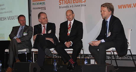 Een panelgesprek over de groentenmarkt: Filip Fontaine (BelOrta), Enrique de los Rios (Unica, Spanje) en Andrew Burgess van Produce World (VK). Chris White leidt het gesprek
