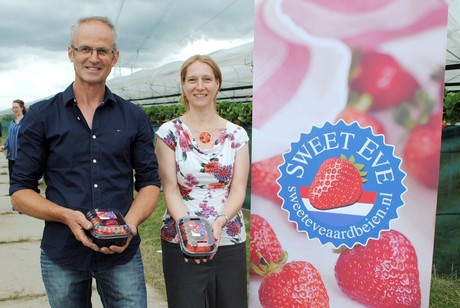 Met manden vol aardbeien komen ze tussen de teeltgoten vandaan, de kinderen die gisteren de eerste Sweet Eve-aardbeien van het seizoen mochten plukken. "Lekker", is het algemene oordeel en dat is precies waar het om gaat bij de nieuwe Sweet Eve-aardbei: een goede smaak. Het merk wordt in de markt gezet door VitalBerry. De organisatie zocht een manier om onderscheid te bieden in het aardbeienschap. "In de supermarkt liggen tien soorten tomaten en vijf soorten appels, maar slechts 1 aardbeisoort", vertelt Ghislaine van Berkom-Smits van VitalBerry. "Daar kunnen we met de Sweet Eve's verandering in brengen." De herkenbaarheid van het merk is daarbij van groot belang. "Ze zijn echt ontwikkeld op kwaliteit, op smaak. Daarop moeten consumenten ze opnieuw kunnen kopen." Vanaf maandag zijn de Sweet Eve's landelijk te koop bij Albert Heijn, in een verpakking van 400 gram. Het seizoen duurt, afhankelijk van het weer, tot half september. Het bedrijf verwacht rond een miljoen bakjes te kunnen doen in die periode. Wat daarna nog aan de plant hangt, is minder van smaak en het bedrijf wil onder het label juist enkel topkwaliteit leveren.