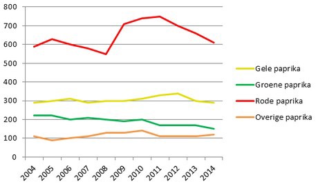 Het totale areaal paprika's is vorig jaar verder gedaald. De paprikateelt in Nederland kende een piek in 2010, toen er 1.400 hectare paprika stond. Daarna is het areaal jaarlijks gedaald. Nu staat er nog 1.160 hectare.