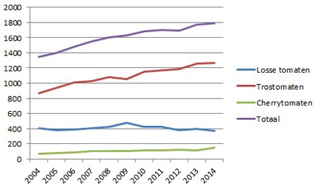 Het areaal tomaten is vorig jaar wederom gegroeid en komt op 1.790 hectare. Belangrijkste oorzaak van de groei zijn de specialties: een groei van 40 hectare leidt tot een areaal van 150 hectare.