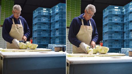 De volgende kool ligt te wachten. Jan Groen verwijdert het buitenste blad, snijdt de kool doormidden verwijdert de stronk en legt de halve kolen in een kist. De stronk verdwijnt in een afvalbak. Op de achtergrond speelt een radio. De volgende kool ligt al op de snijplank.