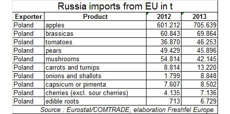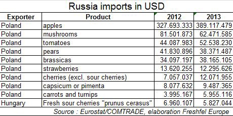 Van de Oost-Europese landen is Polen verreweg de grootste exporteur naar Rusland. Van de zestien meest geëxporteerde producten heeft Hongarije de twaalfde plek in handen. De overige vijftien plekken worden ingenomen door Poolse exportproducten. Appelen staan met stip bovenaan, ruim 705.000 ton. Tweede staan kolen met krap 70.000 ton. Voor de meeste producten waarmee Polen in de top staat, is het exportvolume ten opzichte van 2012 gestegen. Alleen voor peren en paddenstoelen daalde het volume. Hongarije, op de twaalfde plek, krijgt deze positie met de export van zure kersen. In 2013 exporteerde het land 4200 ton kersen. Een jaar eerder was dat 4850 ton.