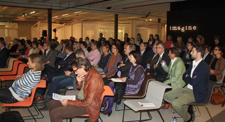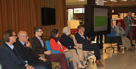 De debaters: Van links naar rechts: Guy Claessens, Jos van Dessel, Kris Verburgh, Loes Neven, Christine Pelckmans, Patrick Aertsen. Rechts naast het scherm: Patrick Mullie en Bartel Dewulf.