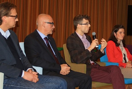 Luisterend naar het betoog van Kris: V.l.n.r.: Guy Claessens, Jos van Dessel, Kris Verburgh en Loes Neven.