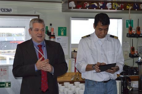 Bert Barmans, CEO ZEspri Europe, opent officieel het Nieuw-Zeelandse seizoen op de brug van de Elvira. Rechts de kapitein van de reefer.