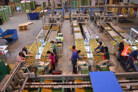 De kiwi's worden met de hand omgepakt naar kleinere verpakkingen.