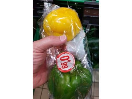 Foto van Twitter. De Franse supermarkt Carrefour kiest voor duo-verpakkingen met groen-geel product. In de handel wordt gesproken over een tekort aan rode paprika's uit Murcia. Oorzaak ligt in het oogsten van groen product vanwege de prima prijzen voor groen.