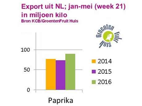 De totale paprika-export tot en met week 21 loopt voor op vorig jaar (cijfers GroentenFruit Huis)