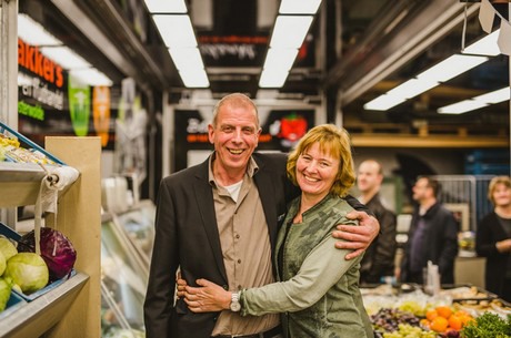 Gerda en Wim Kwakkel genieten samen tijdens de opening van de zelfbedieningskraam. Foto Kwakkel's Groente- en fruithandel