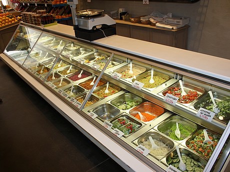 De salades worden in de keuken van het bedrijf zelf gemaakt met groenten en fruit uit de winkel.