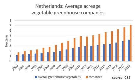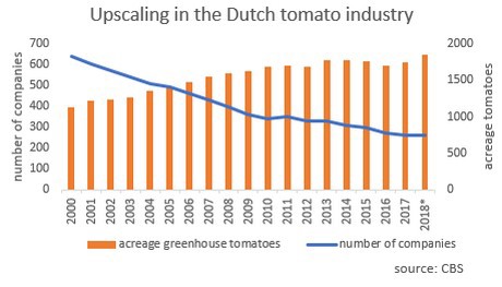 De afgelopen decennia heeft de Nederlandse tuinbouw te maken met sterke schaalvergroting. In twintig jaar tijd is de gemiddelde grootte van een tomatenbedrijf gegroeid van 1,8 hectare in 2000 naar ruim 7 hectare in 2018. Dat blijkt uit de meest recente CBS-cijfers.