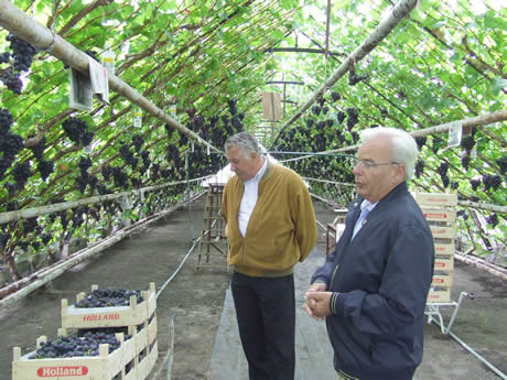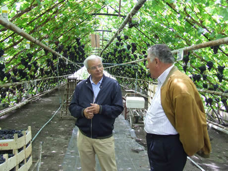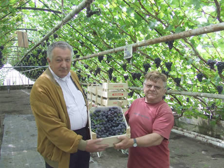 Leo Bravenboer neemt de eerste druiven in ontvangst van Geo van Leeuwen.
