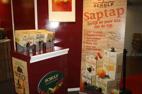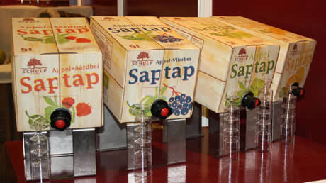 Tholen - Schulp Vruchtensappen toonde tijdens de AGF Detail in Houten een heuse saptap voor de smaken appel/aardbei, appel/vlierbes, appel- en sinaasappelsap. De saptap is een kartonnen doos met daarin een kunststof zak, waaraan een tapkraantje bevestigd is. "Het is een vijf literverpakking, dus het is prijstechnisch voordeliger en je hebt weinig afvalmateriaal", vertelt Jan Hennipman in deze videoreportage.