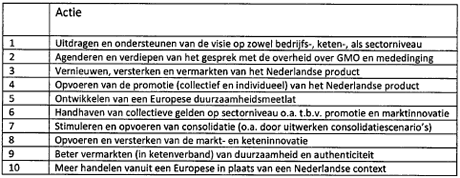 In de rij actiepunten staan onder meer de ontwikkeling van een duurzaamheidsmeetlat, meer promotie voor het Nederlands product, het beter vermarkten van duurzaamheid en authenticiteit en overleg met de overheid over mededinging en GMO groente en fruit. "Het Nederlands product moet weer onderscheidend zijn. De actiepunten moeten voor een deel door bedrijven en telersverenigingen individueel worden opgepakt en in hun toekomststrategie worden vastgelegd. Voor een ander deel zijn collectieve acties nodig van partijen in de sector. Hoe dan ook is meer balans noodzakelijk tussen de klantvraag op Europese schaal en het Nederlandse productaanbod", schrijft de Kerngroep.