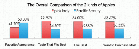 Between the kinds of apples, consumers who prefer the appearance of Pacific Beauty, 58.3%. While consumers think the one fits their taste best, they like best and they want to purchase most is Pink lady, accounting for 65.7%, 64% and 63.67% separately.