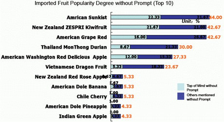 Op de vraag aan welk merk denkt u bij importfruit scoorde het Amerikaanse Sunkist zeer goed, gevolgd door Zespri.