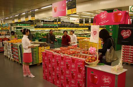 De Pink Lady campagne in Azië is gericht op de markt in Shanghai, waar ook fruit te koop is uit Chili en Nieuw-Zeeland. .