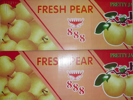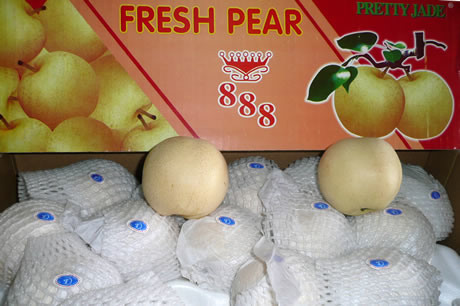 Deze eerste geel gekleurde Nashi-peren zijn van de variëteit Emerald. Nico Schaft van 888 vertelt hierna ook andere soorten binnen te krijgen zoals Century, Crystal, Crown en Golden. Alle producten uit China worden verhandeld onder het eigen merk 888. "We verkopen de Nashi-peren voornamelijk aan Chinese groothandels, maar ook steeds meer aan de grootwinkelbedrijven met name hier in Frankrijk", vertelt de importeur.