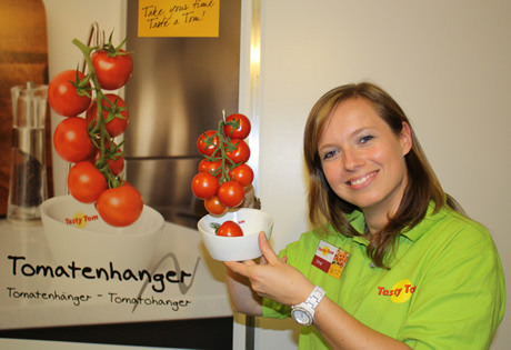 Tholen - De tomatentelers van Tasty Tom presenteerden tijdens de AGF Detail een heuse noviteit. "Ton Janssen merkte na 180 dagen de sector promoten op de Floriade dat veel consumenten tomaten nog altijd in de koelkast bewaren. Al bij een temperatuur onder 12°C boeten de tomaten in aan smaak en dat is echt funest voor de smaaktomaat", zegt Ine van Kleef. "Daarom hebben we een tomatenhanger ontwikkeld, die niet alleen als gebruiksvoorwerp dient, maar ook als mooie blikvanger in de keuken."