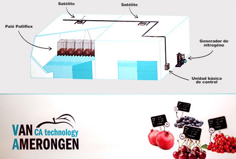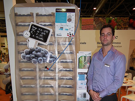 Tholen - Van Amerongen CA Technology presenteerde tijdens de Fruit Attraction het Palliflex-systeem voor de zachtfruitbewaring. Het systeem bestaat uit hoezen, die gasdicht aansluiten op de pallet. De hoezen worden geconditioneerd (O2, CO2) naar wens. Het systeem is niet alleen flexibel - er kunnen hoezen aan het systeem gekoppeld of verwijderd worden zonder de condities in andere hoezen te verstoren - , maar in elke hoes kan ook een andere conditie aangelegd worden en dus een ander product bewaard worden. Niels Remmelink is enthousiast over de interesse tijdens de beurs in Madrid. "Er lopen hier veel mensen uit de zachtfruitsector rond, met name uit Zuid-Amerika waar veel blauwe bessen worden geteeld."