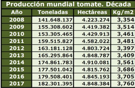 Volgens gegevens van Hortoinfo, afkomstig van Faostat, werd er in 2017 wereldwijd 182.301 mln. kilo tomaten geteeld en werd hiermee een historisch record bereikt. De productie is de afgelopen 10 jaar met 35,76% gestegen.