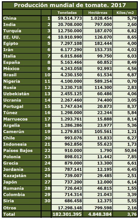 In 2017 teelde Spanje 4 keer zoveel tomaten als Marokko en 5,5 keer meer dan Nederland. Turkije teelde op haar beurt tweemaal zoveel als Spanje. China, de eerste wereldproducent, teelde 11,5 keer meer dan Spanje. De totale wereldproductie bedroeg meer dan 180.000 mln. kilo, geteeld op een oppervlakte van bijna 5 mln. hectare.