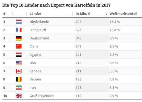 Bij de export van aardappelen (net als bij vele andere landbouwproducten), stond Nederland in 2017 op één met een wereldmarktaandeel van meer dan 18%. Op plaats twee en drie volgen andere EU-landen: Frankrijk en Duitsland met een aandeel van bijna 14% c.q. 9% aan de wereldwijde export van aardappelen, die in totaal uitkwam op 3,8 miljard euro.
