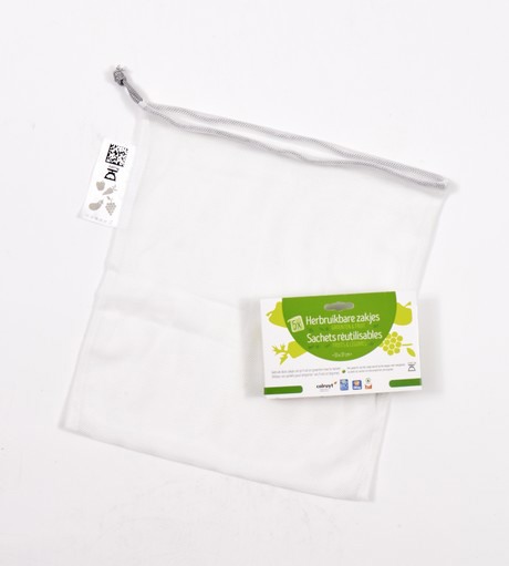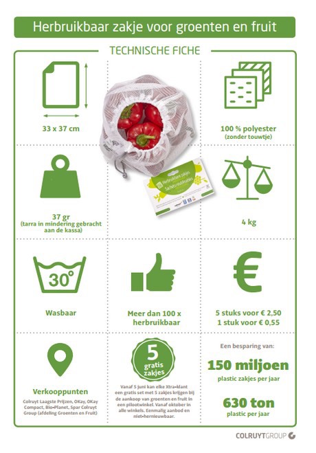Colruyt Group heeft een herbruikbare verpakking laten ontwikkelen dat meer dan 100 keer hergebruikt kan worden. Het doorzichtige zakje kan gewassen worden in de wasmachine en kan tot 4 kg aan producten dragen. Aan de kassa wordt het tarragewicht (37gram) automatisch verrekend, zodat de klant enkel betaalt voor het nettogewicht van groenten en/of fruit. Door een uniforme oplossing voor alle winkelformules aan te bieden, wil de groep het de klanten makkelijk maken om over te schakelen. Christophe Dehandschutter, Verkoopdirecteur van Colruyt Laagste Prijzen en verantwoordelijk voor dit project: “We blijven sterk geloven in de verkoop van onverpakte groenten en fruit. De keuzemogelijkheid en het gemak voor de klant staan hierbij centraal. We zijn daarom blij een zo duurzaam mogelijke oplossing te kunnen voorstellen, die ook rekening houdt met het gebruiksgemak voor de klant. Met de medewerking van al onze klanten zal het nieuwe zakje ons toelaten jaarlijks ongeveer 150 miljoen plastic zakjes te vermijden.”