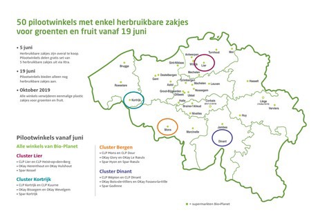 Op 19 juni 2019 wordt gestart in 50 pilotwinkels: alle Bio-Planet winkels (29) en 21 voedingswinkels van Colruyt Laagste Prijzen, OKay, OKay Compact en Spar Colruyt Group in de regio’s Lier, Kortrijk, Bergen en Dinant. Zij zullen als eerste alle zakjes voor eenmalig gebruik voor groenten en fruit volledig schrappen uit de winkels.
