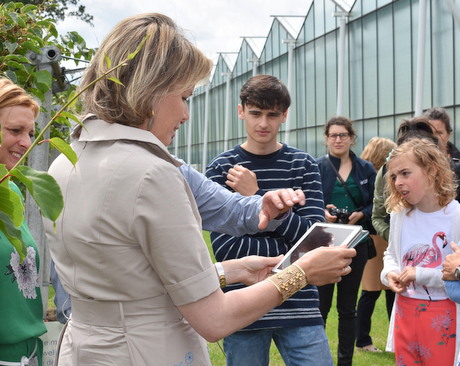 Koningin Mathilde leert hoe ze aardbeien moet plukken