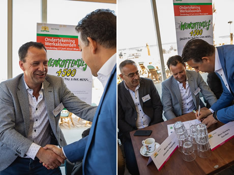 De ondertekening van de werkakkoorden vond plaats bij strandpaviljoen Blue Lagoon op Scheveningen. Namens Euro West was algemeen directeur Marco Vijverberg aanwezig om het akkoord te ondertekenen met verantwoordelijk wethouder Rachid Guernaoui. Bij deze gelegenheid werden in totaal 47 werkakkoorden getekend door bedrijven in de sectoren horeca & hospitality, transport & agrilogistiek, en zorg & facilitair. Deze 47 werkakkoorden zijn goed voor liefst 389 banen. Momenteel staat de teller van getekende werkakkoorden op 106, waarmee in totaal 848 mensen aan het werk kunnen die nu nog een bijstandsuitkering ontvangen.
