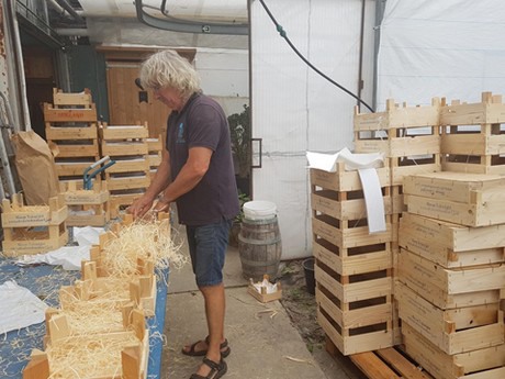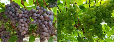 De druiven, waar mensen zelfs in april al naar komen vragen glimlacht Hilde, zijn een echt seizoensproduct. In 14 kassen staan 1500 bomen met daarin verschillende rassen die allemaal gespreid in productie komen. “Er zit een mooie overlap in. De witte en blauwe Frankenthaler zijn steevast als eerste rijp, waarna de andere rassen volgen. Ons uitgangspunt is altijd om in de derde week van augustus met het oogsten te kunnen beginnen en dat is, ook zonder verwarming, weer goed gelukt.”