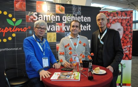 Johan Van Alphen deed een rondje beurs, want ook bij Veiling Zaltbommel liep hij even langs. Hier met links Henk Bekkers en rechts Arthur Elsen. Bij Veiling Zaltbommel werd begin december begonnen met Elsanta's uit Portugal en dit zal doorlopen tot eind april/begin mei. Binnenkort komt ook 'smaakaardbei' Gariguette erbij.