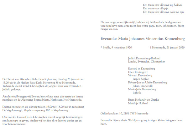 Na een oneerlijke strijd die 4 jaar geduurd heeft is Everard Kronenburg dinsdag 21 januari in het bijzijn van zijn gezin op 49 jarige leeftijd overleden. Altijd positief en hoopvol, nooit geklaagd is hij de strijd aangegaan die hij uiteindelijk niet kon winnen.