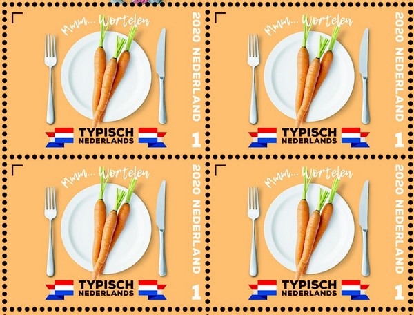 Oranje wortelen horen bij Nederland. Daarom staan ze afgebeeld op het nieuwste postzegelvel uit de serie Typisch Nederlands die PostNL vandaag uitbrengt.