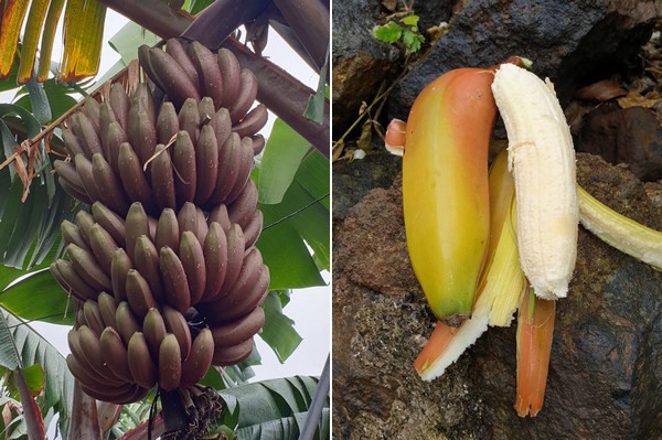 De kleur van de banaan houdt het midden tussen paars en bruin. De schil is dikker dan die van gele bananen. Het fruit is wat kleiner dan de gangbare banaan en heeft een verrassend zoete en lichte smaak die aan frambozen doet denken.