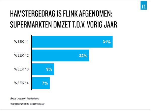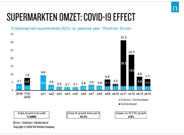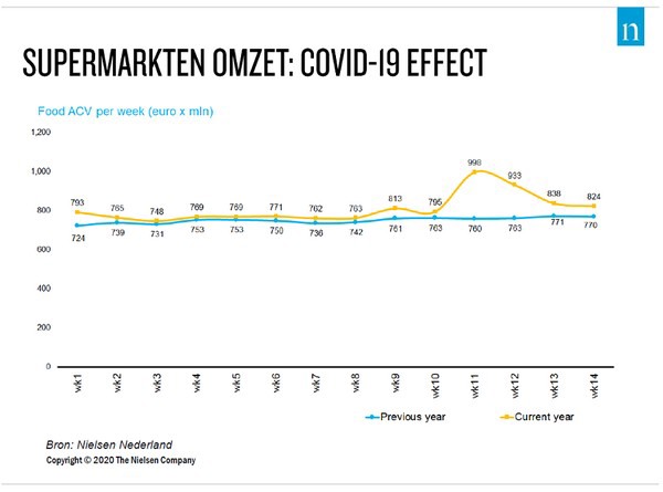 Ongeveer een week nadat premier Rutte de "intelligente lockdown" tot 28 april had verlengd, bedroeg de omzet van de supermarkten in totaal 824 miljoen EUR, een groei van +7,1% ten opzichte van dezelfde week vorig jaar, volgens Nielsen.