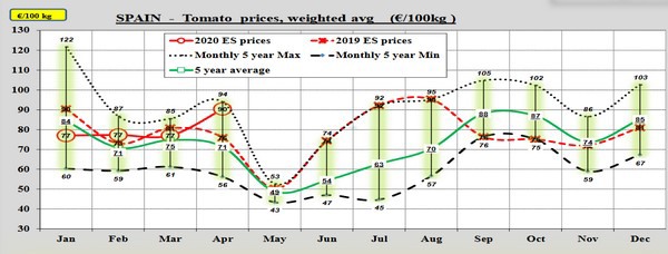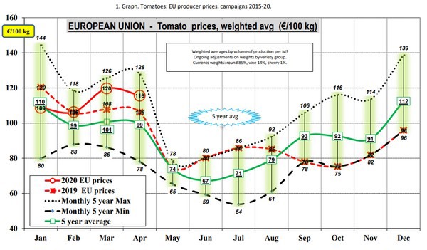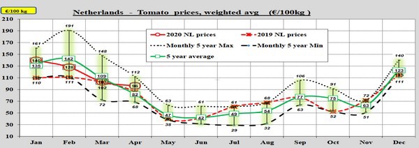 Het gemiddelde op het Europese tomatendashboard blijft (voorlopig) nog boven dat van 2019 liggen en ook ruim boven het vijfjarig gemiddelde. Afwachten is wel wat het vertraagd op gang komen van de grotere tomatenvolumes ('een geluk bij een ongeluk') gaat doen, terwijl zolang de horeca in veel landen gesloten blijft het met de specialties heel moeizaam blijft gaan.